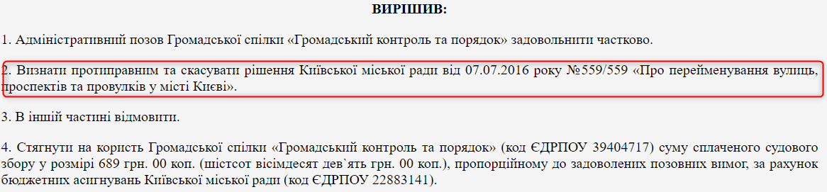 Истец - организация "Громадський контроль та порядок" - осенью 2016 года подала в суд на решение Киевсовета от 7 июля 2016 года (оно, кстати, с сайта КГГА уже удалено).