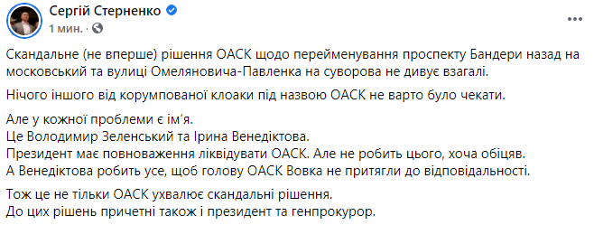 О том же пишет также недавно выпущенный из СИЗО, зарезавший человека националист Сергей Стерненко. Он обвинил в случившемся Владимира Зеленского и генпрокурора Ирину Венедиктову - за то, что не ликвидируют ОАСК.