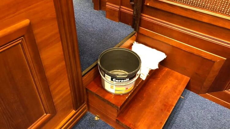 Судя по снимкам, протечка произошла около системы освещения, установленной при вентиляции возле входа в сессионный зал. Для сбора капающей с потолка воды поставили ведро.