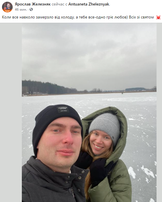 Нардеп Ярослав Железняк от "Голоса" выложил фото с женой Антуанеттой. "Когда все вокруг замерзло от холода, а тебя все равно греет любовь", - подписал он снимок.