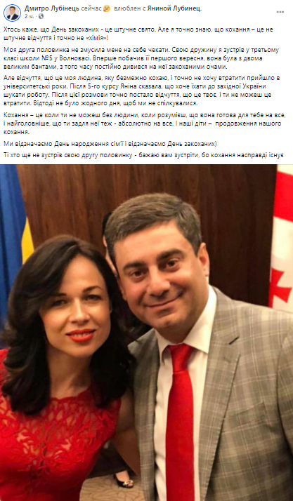 Его однопартиец Дмитрий Лубинец показал фото жены Янины и признался, что познакомился с ней еще в школе: "Свою жену я встретил в третьем классе школы №5 в Волновахе".