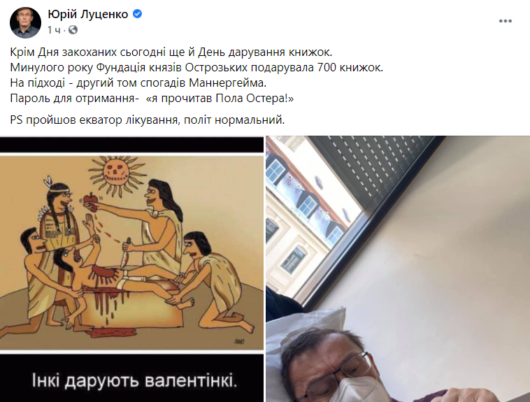 А вот экс-генпрокурор Юрий Луценко решил пойти другим путем. Вместо фото с женой Ириной он запостил картинку, как индейцы вырезают сердце у жертвы с подписью: "Инки дарят валентинки". Также он дал понять, что отмечает не день влюбленных, а день дарения книг, который также празднуют сегодня. И сообщил, что продолжает лечение от рака.