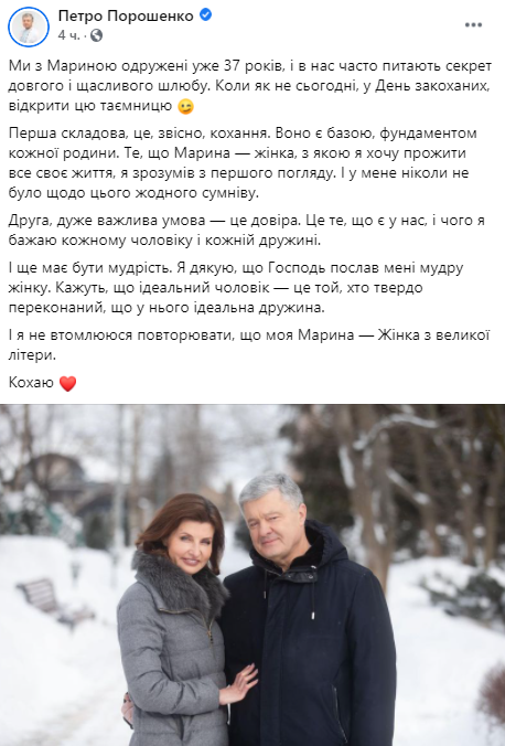 Отметился на теме экс-президент Петр Порошенко. Он написал пост, что с женой Мариной (главой фракции ЕС в Киевсовете) вместе уже 37 лет, и дал три совета счастливого брака.