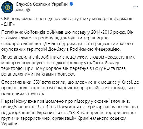 СБУ сегодня, 15 февраля, сообщила о подозрении экс-заместителю "министра информации ДНР". Он, как оказалось, жил и работал в Киеве.