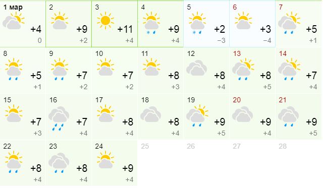 Далее термометры днем покажут +3...+7, ночью 0...-6. Ближе к концу марта днем потеплеет до +8...+9, ночью 0...+2.