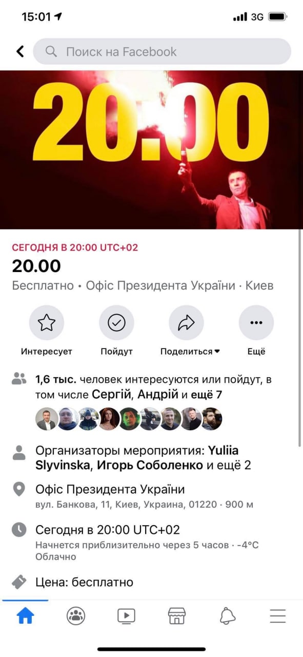 Более 1,6 тысяч человек заинтересовались этой встречей. Начнется она во вторник, 23 февраля, в 20:00 (по Киеву) возле здания Офиса президента на улице Банковой.
