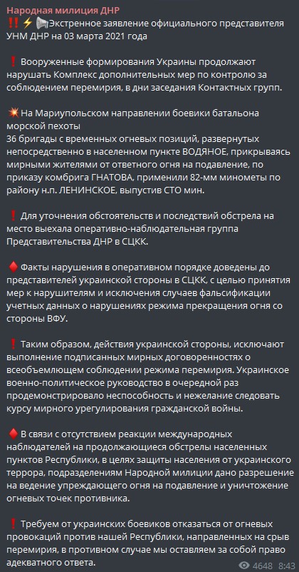 "В связи с отсутствием реакции международных наблюдателей на продолжающиеся обстрелы населенных пунктов "республики" и в целях защиты населения от украинского террора подразделениям Народной милиции дано разрешение на ведение упреждающего огня на подавление и уничтожение огневых точек противника", — говорится в сообщении.