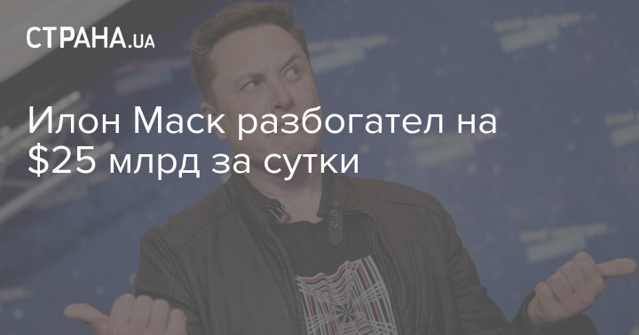 Основатель компании электромобилей Tesla и космической техники SpaceX американский миллиардер Илон Маск всего за сутки увеличил свое состояние на 25 миллиардов долларов благодаря росту акций Tesla на 20%.