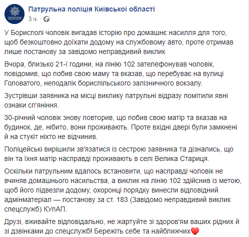 Мужчина получил постановление за заведомо ложный вызов. Фото: facebook.com/kyivregionpatrolpolice