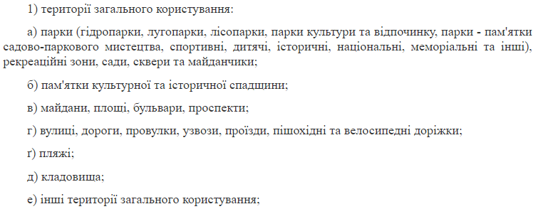 1. Парки (гидропарки, лугопарки, лесопарки, парки культуры и отдыха, парки - памятники садово-паркового искусства, спортивные, детские, исторические, национальные, мемориальные и другие), рекреационные зоны, сады, скверы и площадки,
