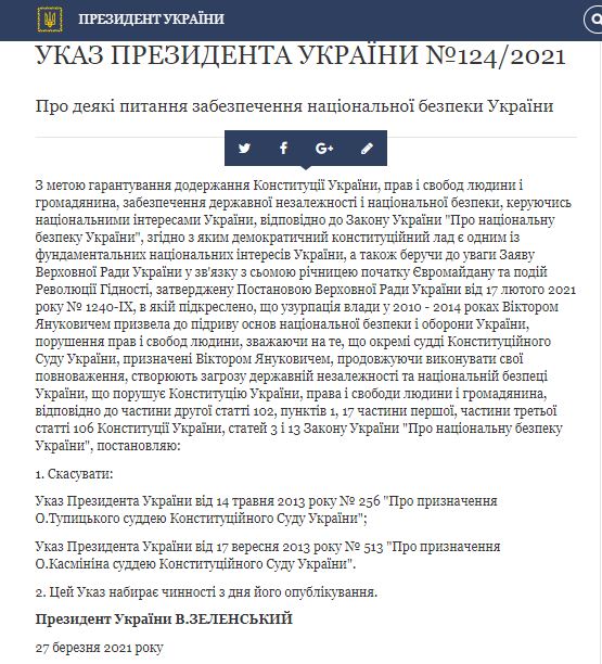 В субботу, 27 марта, президент Украины Владимир Зеленский подписал указ, который отменяет указ Виктора Януковича от 14 мая 2013 года №256 "О назначении А.Тупицкого судьей Конституционного суда Украины". Тупицкий сейчас является действующим главой КСУ.