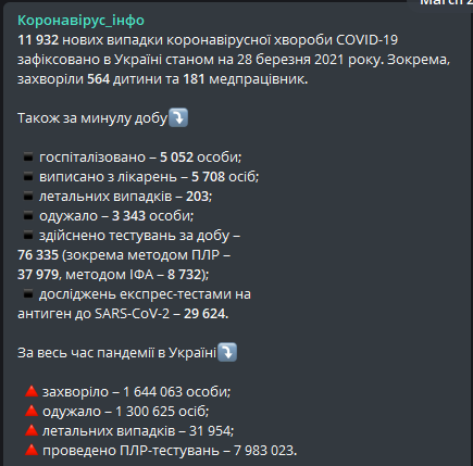 В Украине за минувшие сутки произведено 5 032 госпитализации из-за Covid-19. По состоянию на 28 марта зафиксированы 11932 новых случая заболевания.
