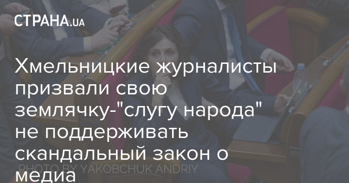 Журналисты Хмельницкой области призвали свою землячку и народного депутата от "Слуги народа" Ольгу Василевскую-Смаглюк повлиять на снятие с рассмотрения проекта закона "О медиа", так как он "содержит серьезные угрозы свободе слова и может привести к наказанию журналистов за объективную критику".