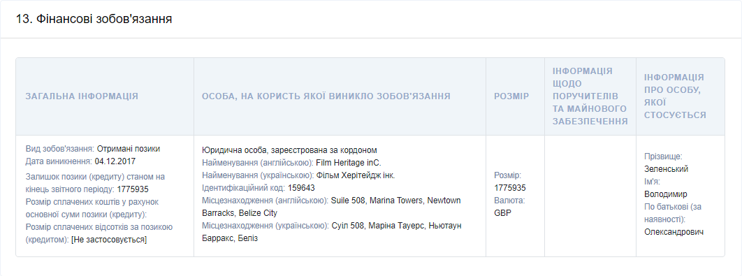 В частности, в пункте 13-м о финансовых обязательствах указано, что Владимир Зеленский взял в долг 1,77 млн фунтов стерлингов (около 2,5 млн долларов или почти 69 миллионов гривен). Эти деньги принадлежат компании Film Heritage inC в Белизе. Ее бенефициарным владельцем указана супруга президента - Елена Зеленская.
