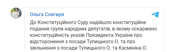 "В Конституционный Суд поступило конституционное представление народных депутатов, в котором обжаловано конституционность указов президента Украины об отстранении от должности Тупицкого А. и об освобождении от должности Тупицкого А. и Касминина А.", - написала Совгиря.