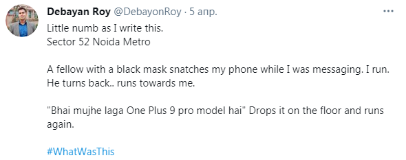 "Бро, я думал, что у тебя смартфон OnePlus 9 Pro", - сказал разочаровавшийся злоумышленник, когда приблизился к Рою. После этого он бросил телефон журналиста на пол и снова убежал.