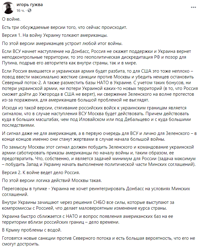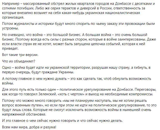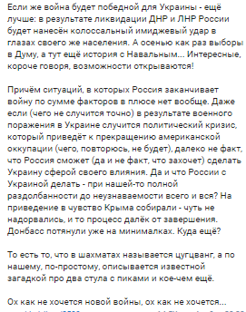 Если же война будет победной для Украины - ещё лучше: в результате ликвидации ДНР и ЛНР России будет нанесён колоссальный имиджевый удар в глазах своего же населения. А осенью как раз выборы в Думу, а тут ещё история с Навальным... Интересные, короче говоря, возможности открываются!