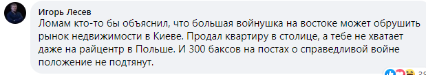 "Ломам кто-то бы объяснил, что большая войнушка на востоке может обрушить рынок недвижимости в Киеве. Продал квартиру в столице, а тебе не хватает даже на райцентр в Польше. И 300 баксов на постах о справедливой войне положение не подтянут", - отвечает журналист Игорь Лесев.