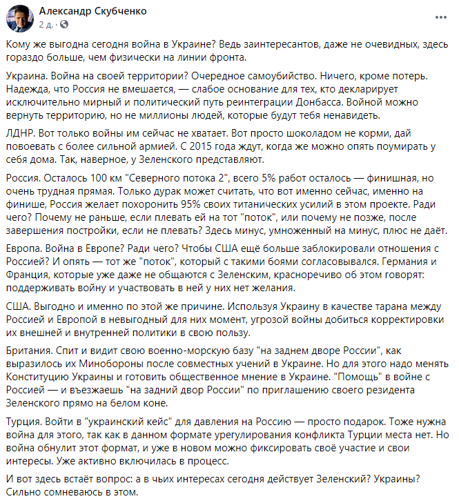 Украинской власти выгодно поддерживать напряжение на фронте, чтоб иметь возможность "приглушить" любую критику и действия оппозиции обвинениями "в работе на Россию". Постоянные разговоры о том, что Россия вот-вот пойдет в наступление, дают мандат на жесткие действия против противников Зеленского под лозунгом "борьбы с пятой колонной". Кроме того, "предвоенная" атмосфера дает повод просить Запад об увеличении поддержки и о смягчении требований предоставления такой поддержки (ну, чтоб не требовали суды им под контроль отдавать).