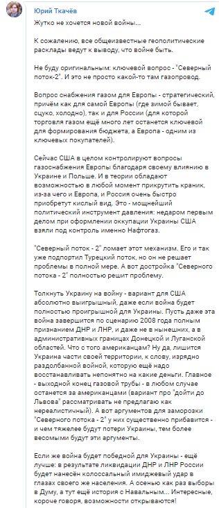Журналист Юрий Ткачев видит основной причиной возможной войны "Северный поток - 2". А среди основных заинтересантов столкновения блогер называет США.