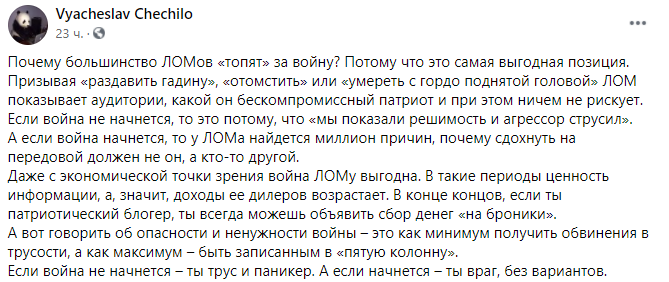"Почему большинство ЛОМов "топят" за войну? Потому что это самая выгодная позиция. Призывая "раздавить гадину", "отомстить" или "умереть с гордо поднятой головой" ЛОМ показывает аудитории, какой он бескомпромиссный патриот и при этом ничем не рискует.