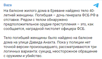 Тело 40-летней женщины было обнаружено на балконе жилого дома в Ереване, на улице Давида Анахта. Погибшая - дочь генерала ФСБ РФ в отставке. Рядом с телом обнаружено предположительное орудие преступления - это, как сообщается, наградной пистолет высокопоставленного офицера ФСБ.