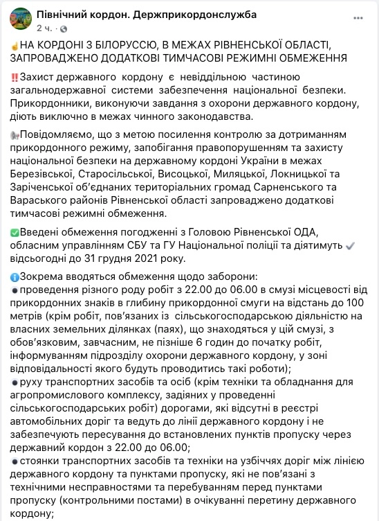 Ограничения введены в пределах Березовской, Старосельской, Высоцкой, Милячской, Локницкой и Зареченской объединенных территориальных громад Сарненского и Вараського районов Ровенской области.