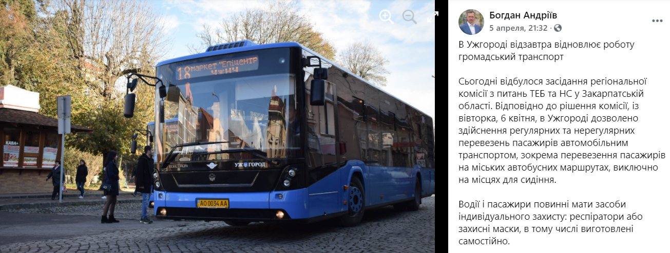 Так, в Ужгороде с 6 апреля возобновил работу общественный транспорт. Об этом писал мэр города Богдан Андреев.