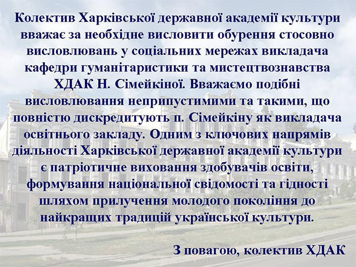 "Академия культуры не имеет отношения к подобным высказываниям. На сегодня этим вопросом занимается СБУ. Мы проведем разъяснительную работу с работниками заведения, чтобы избежать таких ситуаций в будущем", - прокомментировал первый проректор ХГАК Юрий Лошков.