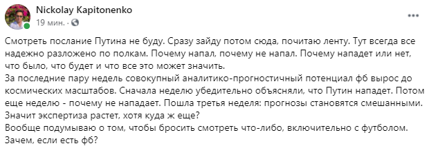 "Смотреть послание Путина не буду. Сразу зайду потом сюда, почитаю ленту. Тут всегда все надежно разложено по полкам. Почему напал, почему не напал. Почему нападет или нет, что было, что будет и что все это может значить.