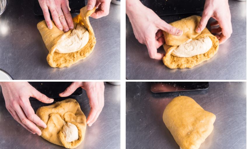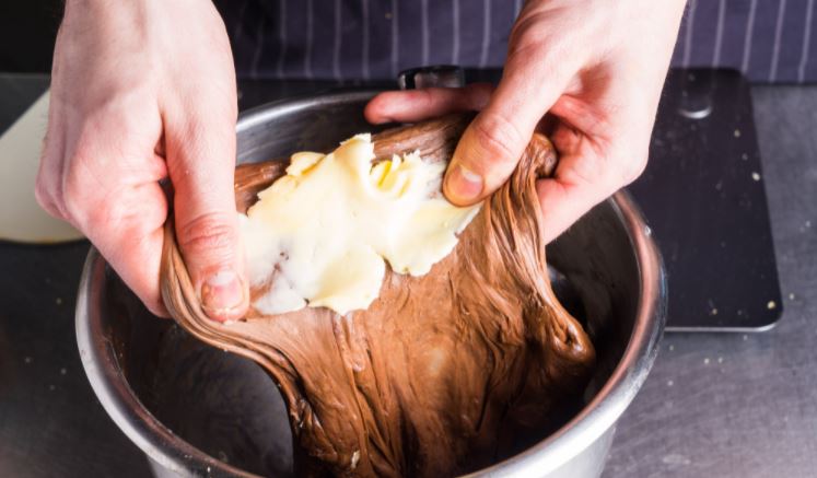 Финишная стадия приготовления теста. Вымешивайте тесто и постепенно добавляйте в него оставшиеся ингредиенты - 50 гр сахара, 8 гр соли, 20 гр тримолина, 60 гр какао-порошка хорошего качества и 60 гр молока. Подождите пока тесто снова станет гладким и эластичным. После этого добавьте порциями 200 гр холодного сливочного масла. Расплющивайте его руками и добавляйте постепенно, чтобы оно смешивалось с тестом. После масла добавьте в тесто цедру.