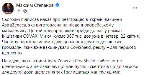 "Сегодня подписал приказ о регистрации в Украине вакцины AstraZeneca, которая изготовлена на южнокорейской площадке", - написал Степанов.