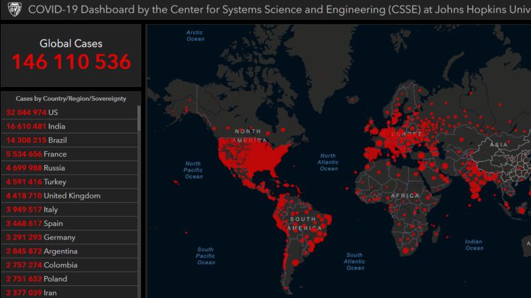 По состоянию на утро 25 апреля, число зараженных в мире перевалило за 146 миллионов, фото: arcgis.com