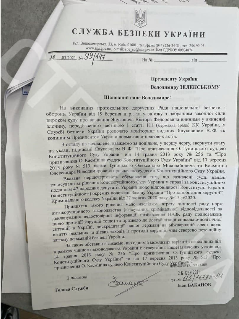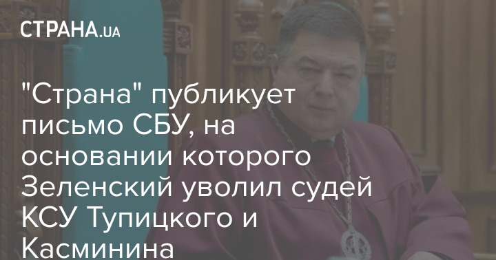 "Страна" публикует письмо СБУ, на основании которого Зеленский уволил судей КСУ Тупицкого и Касминина