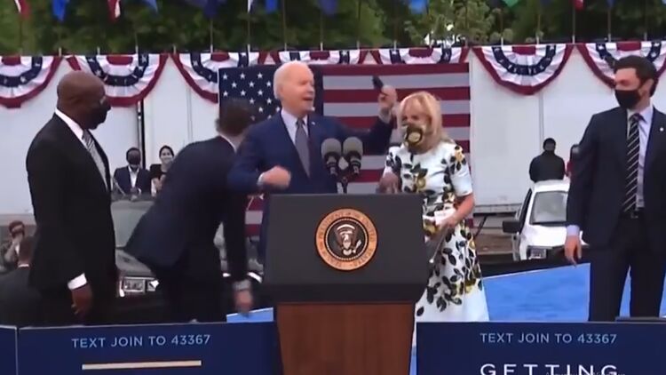 После выступления в Джорджии Джо Байден остался на трибуне и начал искать свою маску. Через несколько мгновений к нему вышли сенаторы штата и первая леди США Джилл Байден, которая начала помогать мужу в поисках.