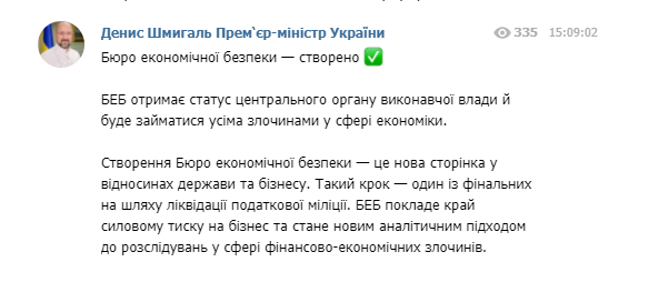 "Создание Бюро экономической безопасности - это новая страница в отношениях государства и бизнеса. Такой шаг - один из финальных на пути ликвидации налоговой милиции. БЭБ положит конец силовому давлению на бизнес и станет новым аналитическим подходом к расследованиям в сфере финансово-экономических преступлений", - написал премьер.
