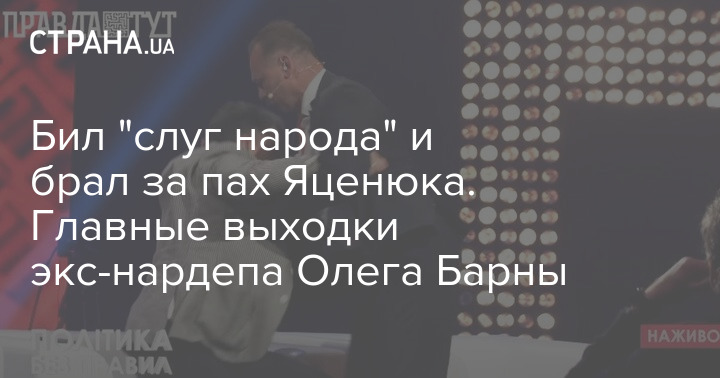 В этот раз он устроил драку в прямом эфире телеканала "ПравдаТут". Барна набросился на нардепа Дмитрия Соломчука из "Слуги народа", поставив ему синяк под глаз.