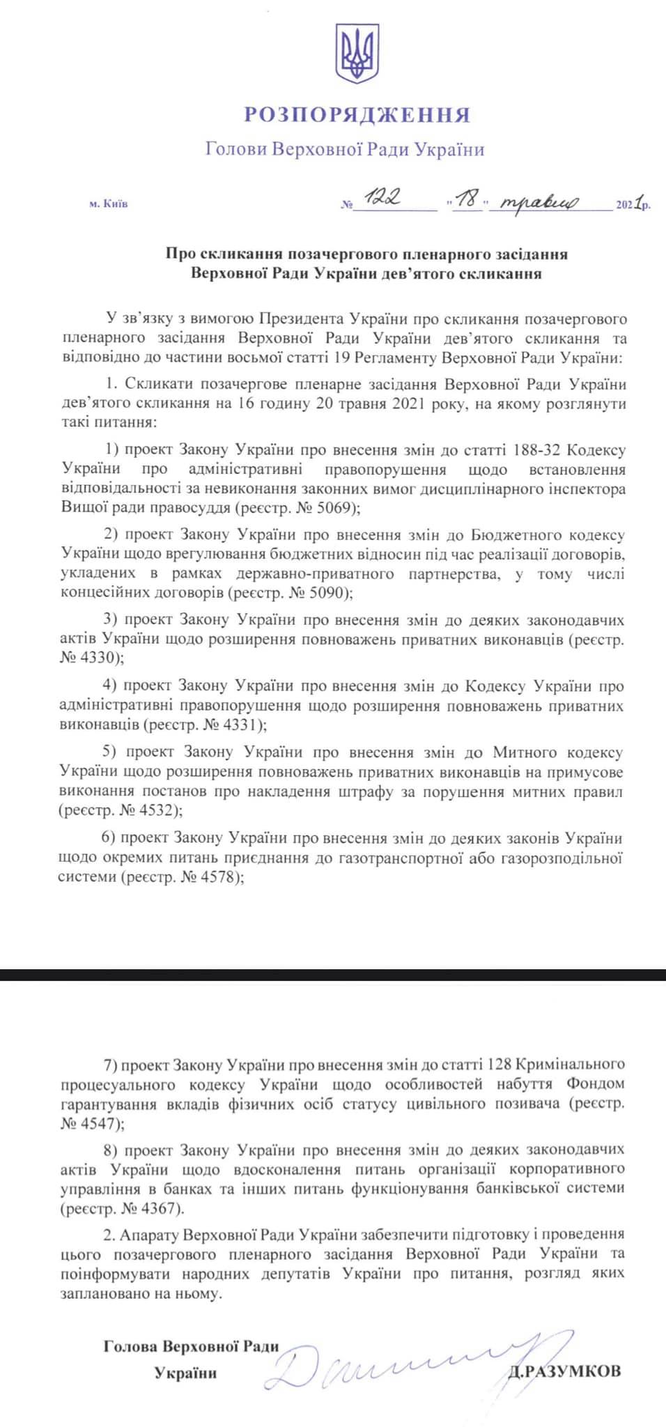 Соответствующее распоряжение председателя парламента Дмитрия Разумкова обнародовала его пресс-секретарь Ольга Туний на своей странице в Facebook.