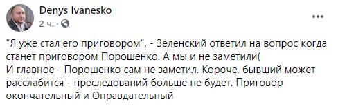 И главное - Порошенко сам не заметил. Короче, бывший может расслабится - преследований больше не будет. Приговор окончательный и Оправдательный".