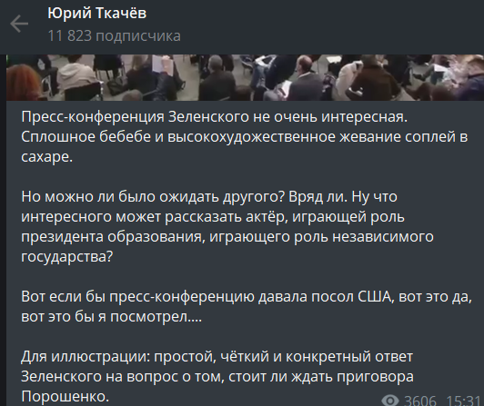 "Пресс-конференция Зеленского не очень интересная. Сплошное бебебе и высокохудожественное жевание соплей в сахаре.