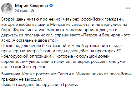 "Второй день читаю про неких "четырёх российских граждан", которые якобы вышли в Минске из самолёта и не вернулись на борт (...) Выяснила. Кроме россиянки Сапеги в Минске никто из российских граждан не выходил. Вышли граждане Белоруссии и Греции", - написала она.