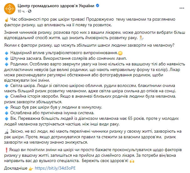Также медики призывают украинцев записаться на прием к семейному врачу, если вы заметили изменения на коже или просто хотите проконсультироваться относительно факторов риска.