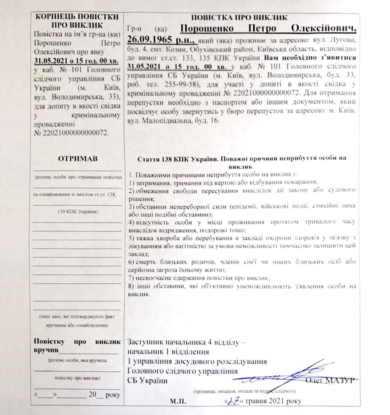 Судя по следственной повестке, экс-президент проходит по делу как свидетель.