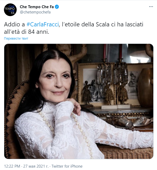 В Италии на 85-м году жизни скончалась знаменитая балерина, прима "Ла Скала" Карла Фраччи. По данным итальянских СМИ, в последнее время она боролась с онкологией, но при этом она продолжала танцевать и преподавать вплоть до последнего дня. Последний мастер-класс она провела в январе 2021 года онлайн, когда театры были закрыты из-за пандемии.