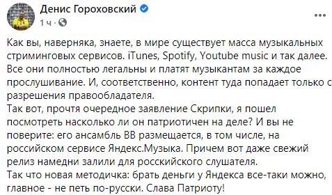 Так вот, прочтя очередное заявление Скрипки, я пошел посмотреть насколько ли он патриотичен на деле? И вы не поверите: его ансамбль ВВ размещается, в том числе, на российском сервисе Яндекс.Музыка. Причем вот даже свежий релиз намедни залили для российского слушателя.