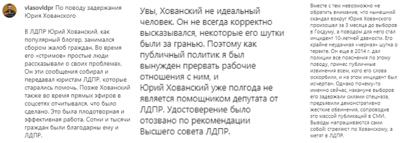 "Почему-то именно сейчас, накануне выборов его задержали силами спецназа, предъявили демонстративно жесткие обвинения, сопроводив это массой публикаций в СМИ. Выводы напрашиваются сами собой: стреляют по Хованскому, а метят в ЛДПР", – написал Власов в Instagram.