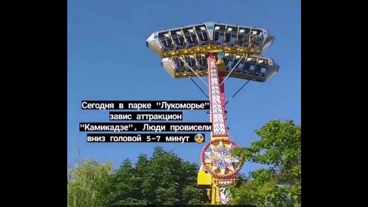 Очевидцы засняли видео, на котором заметно, как во время работы завис аттракцион под названием "Камикадзе". По их информации, люди провели вниз головой на застрявшей карусели 5-7 минут.