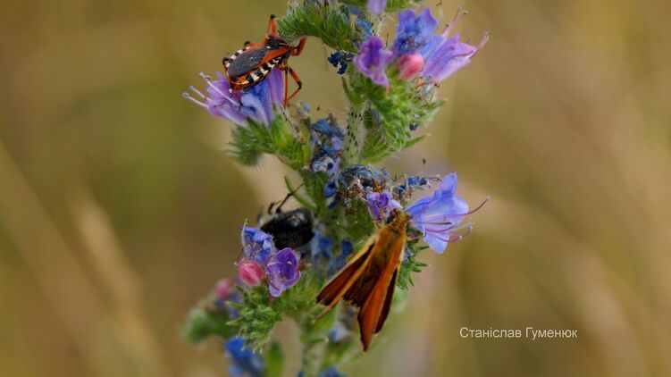 Например, фотограф заповедника поймал кадр, как душистый синяк обыкновенный (Echium vulgare L.) - растение из семейства бурачниковых - увлеченно обследует  с целью найти что-нибудь вкусное охристо-коричневая бабочка толстоголовка тире (Thymelicus lineola). Она явно была не прочь полакомиться сахаристой жидкостью из ярких цветков синяка.
