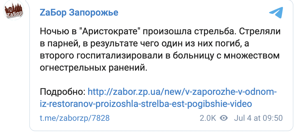 Ночью в воскресенье, 4 июля, в ресторане "Аристократ", расположенном в центре Запорожья, произошла стрельба, в результате которой один человек погиб, а второй был госпитализирован с огнестрельными ранениями.
