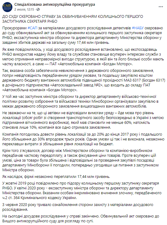 Специализированная антикоррупционная прокуратура не называет имени человека, который вел сделку по линии военного министерства. Но, судя по формулировке должности - замминистра и директор департамента военно-технической политики развития вооружения - речь идет об Игоре Павловском.